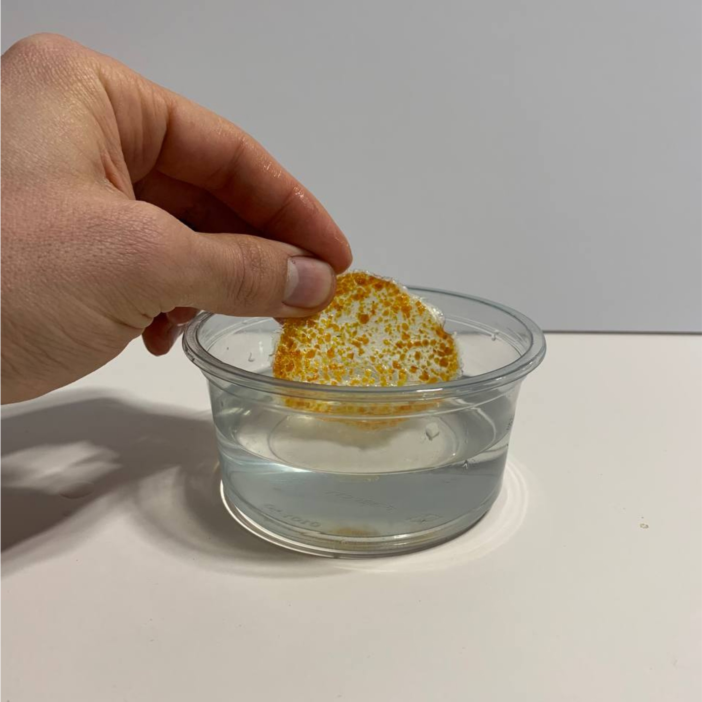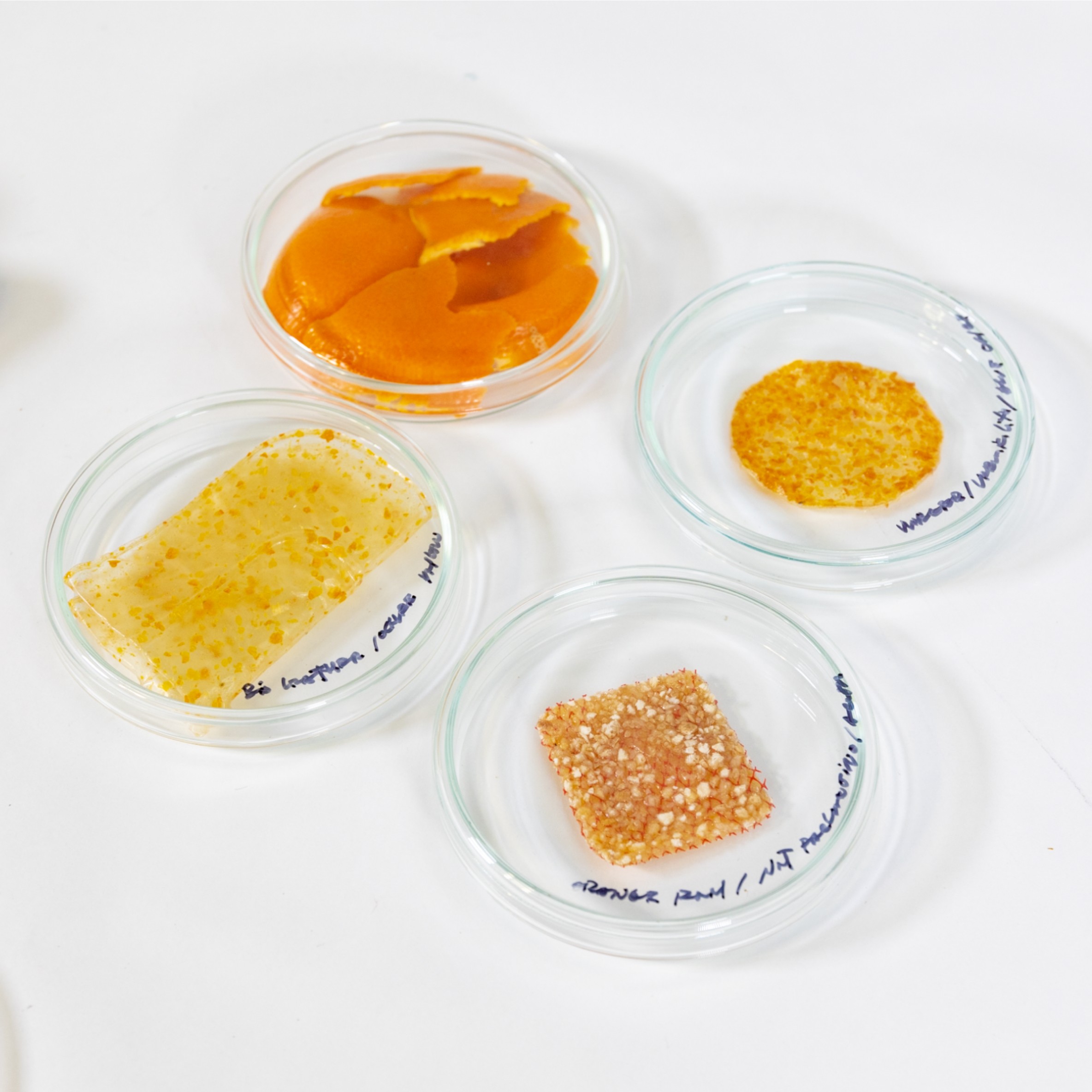 In the second phase, I experimented with agar, sodium alginate, glycerin, spirulina, and waste materials. I created a rigid bioplastic from agar and glycerin, which was ineffective as a sponge cloth but useful as an abrasive cleaner when combined with peanut shells or orange peels. Adding nets from orange packaging stabilized the product and introduced circular design principles.